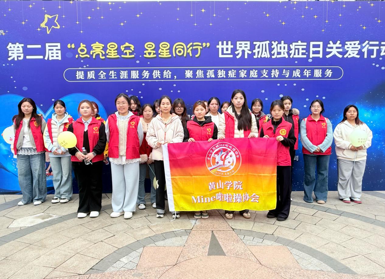在第19个世界孤独症日来临之际,为进一步普及孤独症知识,消除社会偏见,传递温暖与包容,黄山市屯溪区青益社会服务中心正式向我院大学生啦啦操协会发出邀请,诚邀协会学子作为青年志愿者,参与第二届“点亮星空 昱星同行”世界孤独症日主题公益活动,以青春活力为“星星的孩子”点亮希望之光,共筑包容友爱的社会环境。本次活动于3月27日在黄山市大润发C区广场举行,活动现场设置科普宣传、趣味互动、融合体验等多个环节,啦啦操协会的学子们负责啦啦操互动,陪伴孩子们参与趣味互动,搭建起青年群体与特殊儿童之间的情感桥梁。同时,学子们还作为志愿者,协助开展科普宣传、现场引导等工作,向过往市民普及孤独症知识,呼吁更多人关注、理解、接纳孤独症群体。